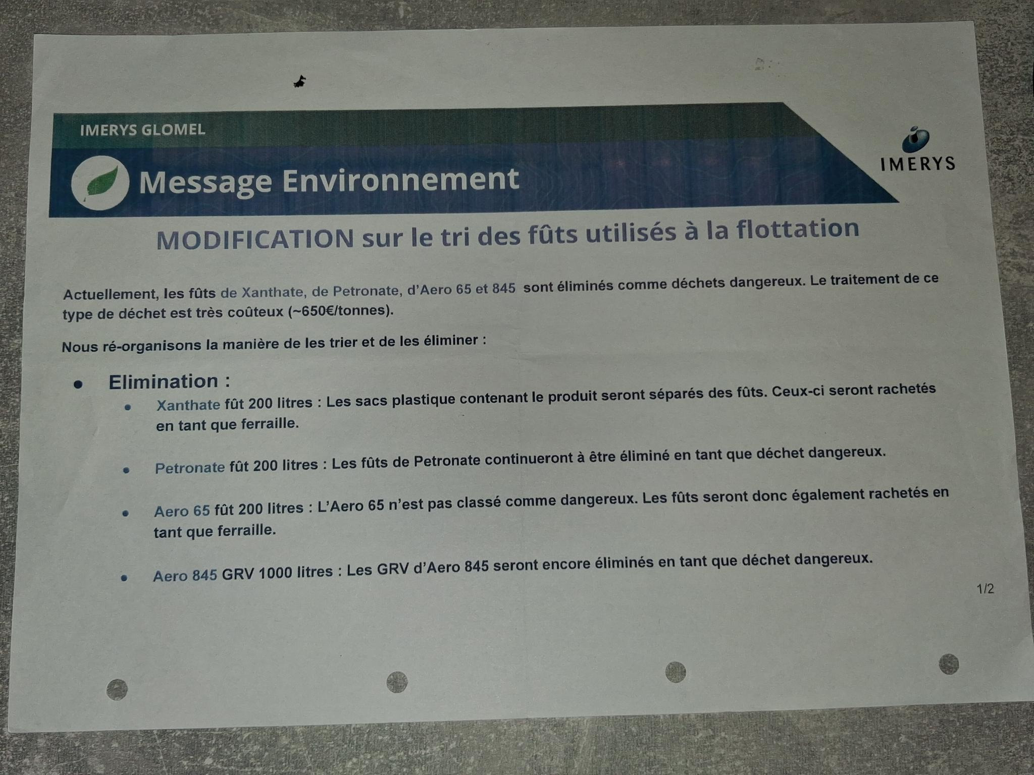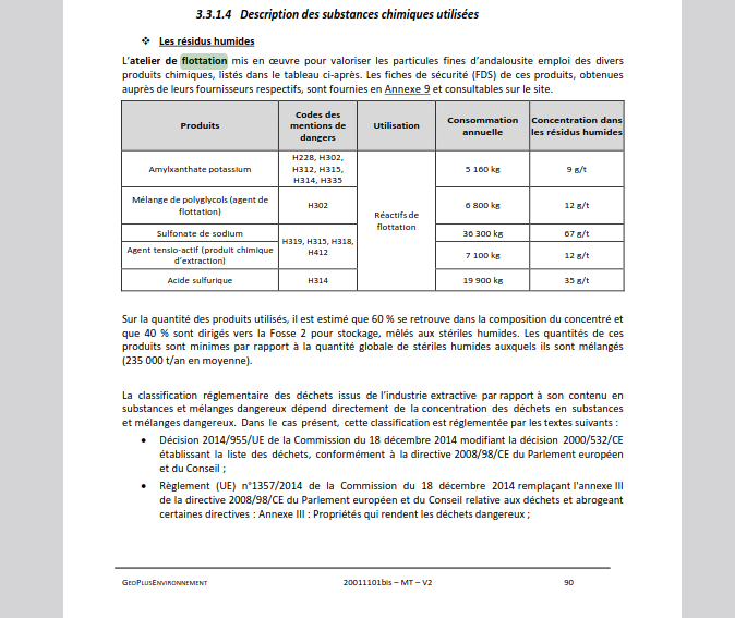 Hervez un notenn diabarzh da Imerys en deus bet tro Splann ! da gaout e tle an endalc’herioù goulo bezañ « skarzhet evel lastez dañjerus ».