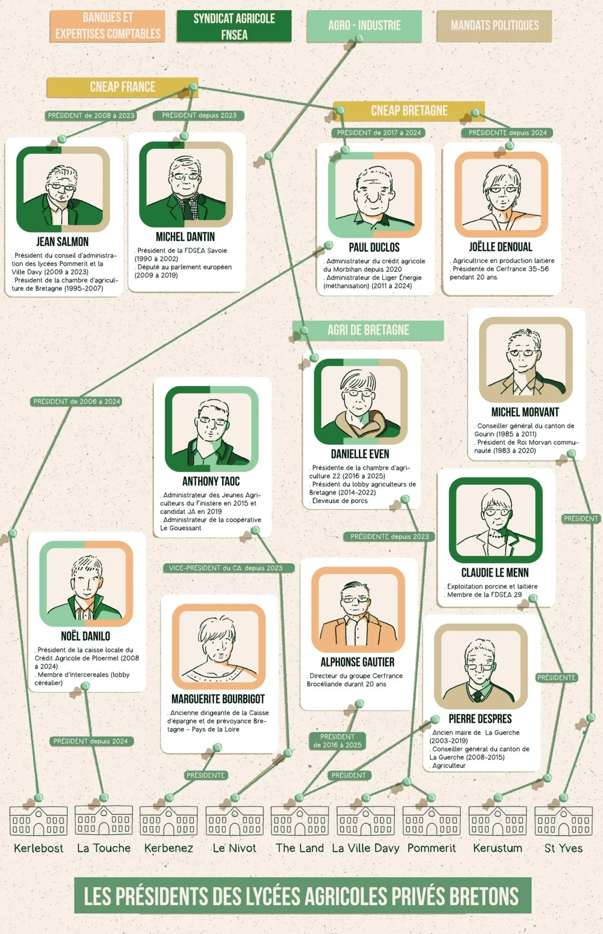 Le parcours de Danielle Even, la présidente du conseil d’administration de l’établissement scolaire, éclaire ces liens d’influence. Cette éleveuse de porcs a en effet été présidente d’Agriculteurs de Bretagne de 2014 à 2022. Elle fait partie du tableau de famille, celui du lobby porcin, cartographié pour Splann !. Membre de la FNSEA, Danièle Even a aussi été présidente de la chambre d’agriculture des Côtes-d’Armor, de 2016 à 2025. Tout un symbole de l’imbrication entre l’enseignement agricole, l’agro-industrie, et le syndicat majoritaire, qui détient les manettes des chambres d’agriculture bretonnes.