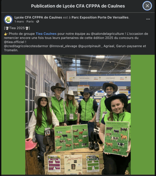 Les élèves eux-mêmes sont incités à démarcher ces entreprises agro-industrielles pour pouvoir financer leur participation au Trophée international de l’enseignement agricole (TIEA) qui a lieu tous les ans lors du Salon de l’agriculture. À cette période de l’année, les publications des lycées et des élèves fleurissent pour les remercier.